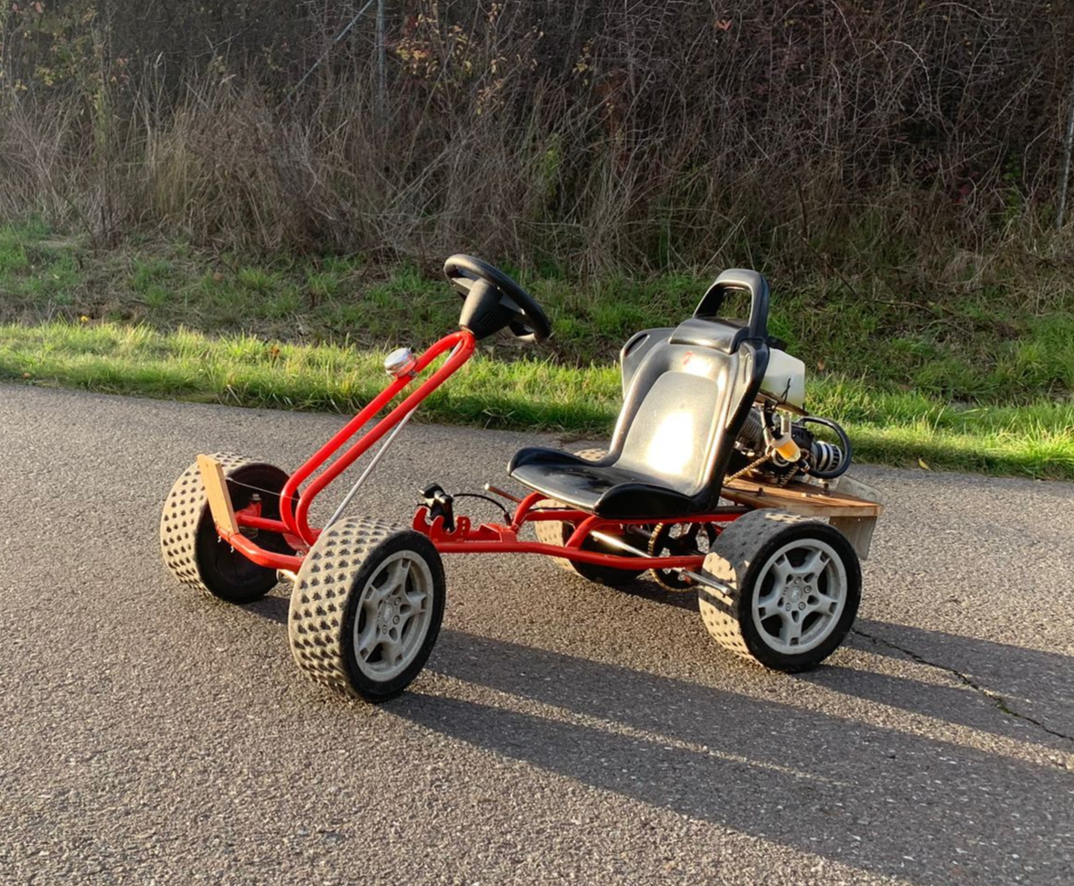 Mein Bester Freund und ich haben aus einem alten Kettcar, ein funktionstüchtiges Go-Kart gebaut. Indem wir einen Verbrennungsmotor mit der Antriebsachse verbunden haben.